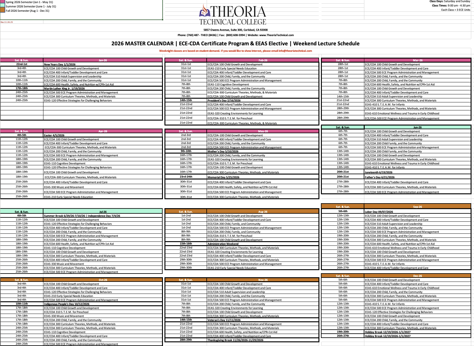 Below is our course schedule for 2026-2027 for our ECE Certificate Programs & Our AS Degree Classes